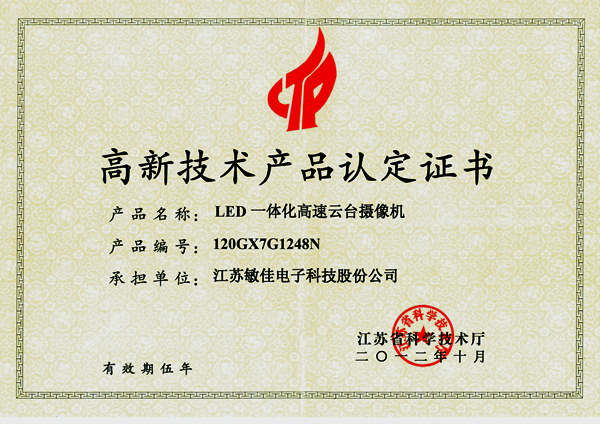 2012年10月,我公司LED一體化高速云臺攝像機獲得由江蘇省科學技術廳頒發(fā)的“高新技術產(chǎn)品認定證書“,編號為:120GX7G1248N。這標志著敏佳高速云臺攝像機在技術創(chuàng)新上邁上了一個新的臺階,同時也是對敏佳高速云臺創(chuàng)新技術實力的充分肯定。 這也是我公司堅持自主創(chuàng)新,積極推進技術現(xiàn)代化,取得的優(yōu)秀成果。一直堅定不移的走自主創(chuàng)新之路,在研發(fā)上投入了大量的人力物力,積極開發(fā)具自主知識產(chǎn)權的核心技術與產(chǎn)品。